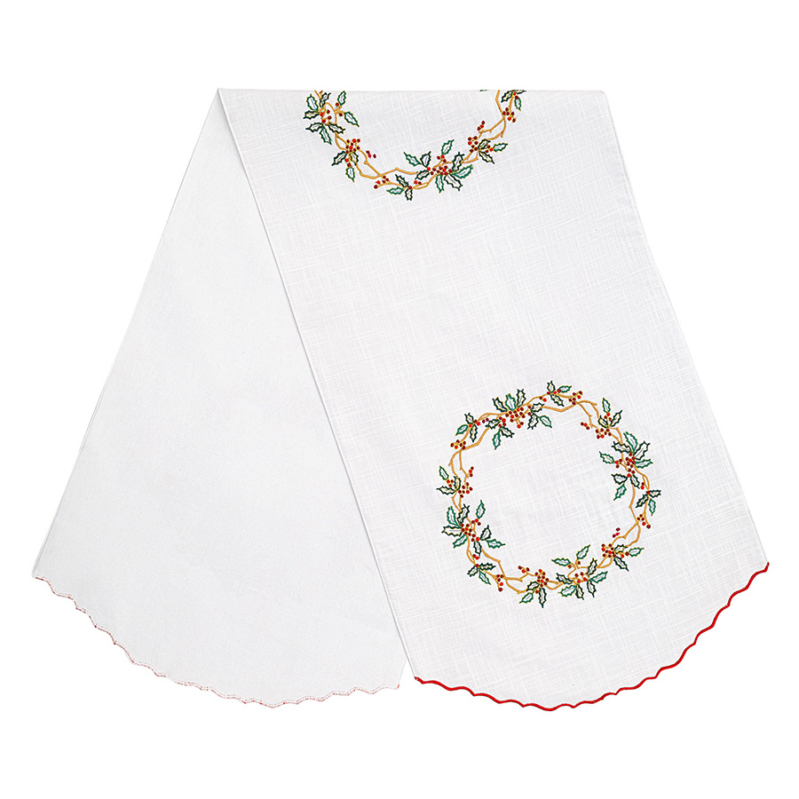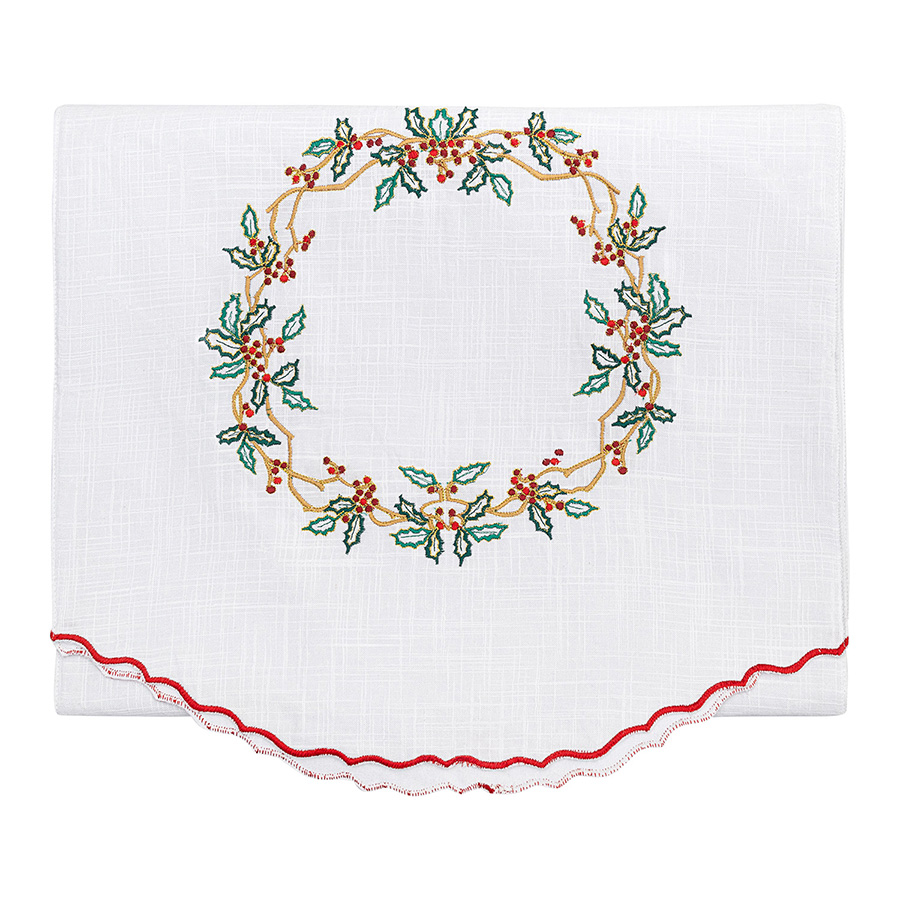 "Дорожка Festive wreath из коллекции New Year Essential – простой способ сделать акцент на деталях сервировки и создать особую атмосферу за столом. Вышивка в виде хвойных веточек и ягод воплощает символику праздника, напоминая о новогоднем волшебстве, подарках и уютных вечерах в кругу семьи и друзей. Дорожка поможет защитить столешницу от пятен, царапин и обозначить посадочные места для гостей.