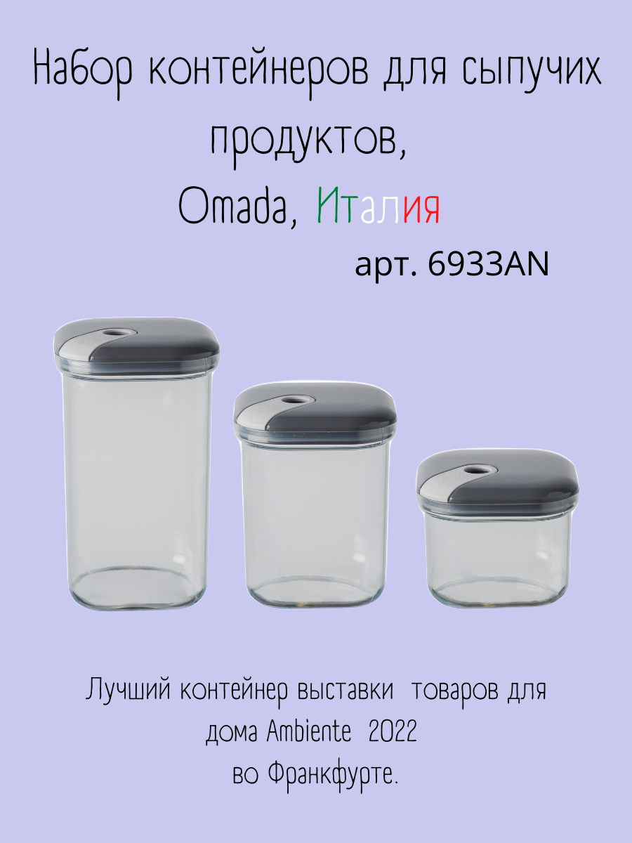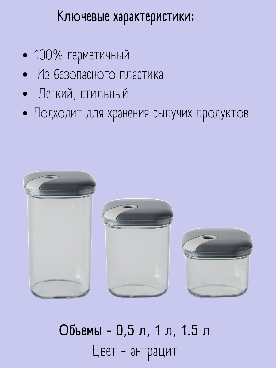 Набор из 3-х емкостей для хранения квадратных 500/1000/1500 мл, цвет антрацит, серия Pull box, OMADA