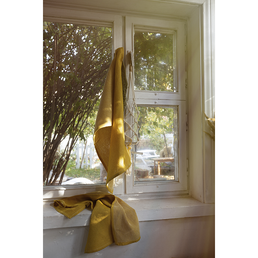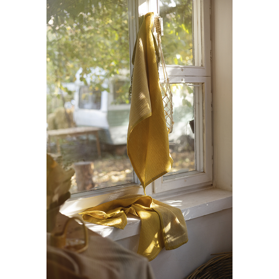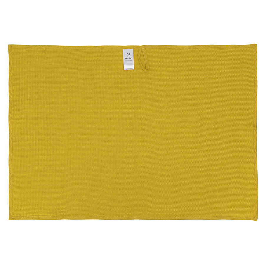 "Набор из двух кухонных жаккардовых полотенец горчичного цвета из коллекции Essential пригодится на любой современной кухни и станет ее украшением. Изделия выполнены из 100%, хлопка. Мягкий и прочный материал также очень практичен — хорошо впитывает влагу, быстро сохнет и не оставляет на посуде ворсинок при протирании. Полотенца имеют удобную петельку для подвешивания на крючок.
