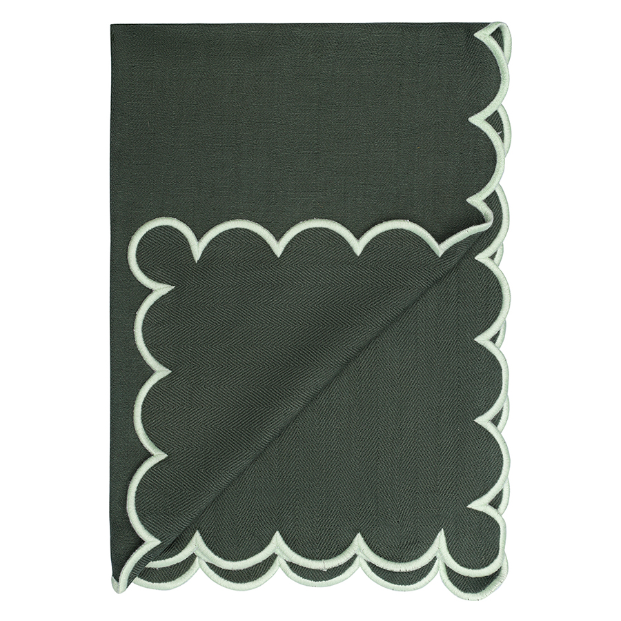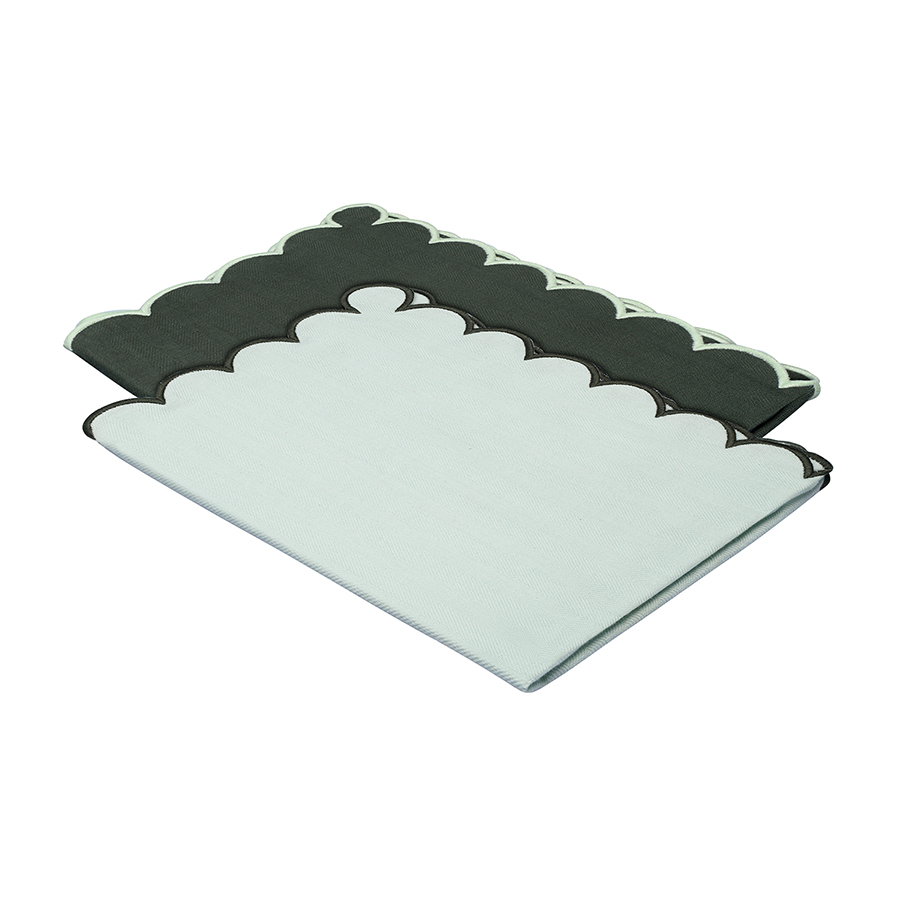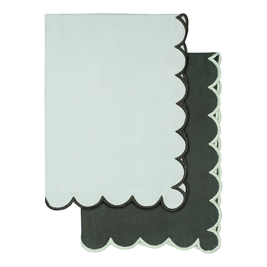 "Набор кухонных полотенец с контрастным кантом зеленого цвета из коллекции Trendy Ruffles идеально подойдет для повседневных задач и в качестве стильного акцента. Текстиль с волнистой отделкой, напоминающей изящные раковины морских гребешков, стал ярким элементом стиля Ар Деко – и сейчас возвращается в моду, появляясь в самых актуальных интерьерных решениях.